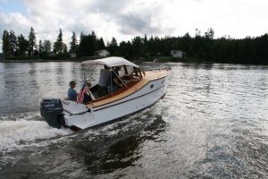 Many months later, both John and his wife were present for a quiet and solemn launch ceremony. Just moments after touching the water however, the engine was throttled up and she roared off over the bay. All of us were pleased with the speed and her presence on the water and it’s really quite hard to imagine a larger little boat design that might exist. She has an interior that has two bunks, the proverbial porta-potti, a galley complete with pressure water, wood stove for interior heat, hanging locker, and lots of sitting headspace. She is really quite the little cruiser and offers her owners the pleasure of getting somewhere in a short amount of time and once the hook is firmly set on the bottom, a calm and comfortable evening lounging in either the cockpit or in the cabin.