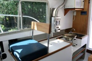 Prize was created by her owners and Sam Devlin prior to and as a precursor to the variety of “trailerable” trawlers that hit the market in 2005/6. The owners liked the Surf Scoter 26 design and while Sam’s shop was fully engaged with a 45’ trawler build at the time, they went to Legendary Yachts (www.legendaryyachts.com), a highly competent wooden boat builder in Washougal, WA. They got together to create Prize with Sam consulting on the project. And just last year (2023) she received a brand new 200 HP Yamaha outboard motor and a brand new 8HP Yamaha kicker outboard. All work was done here at Devlin Boat.