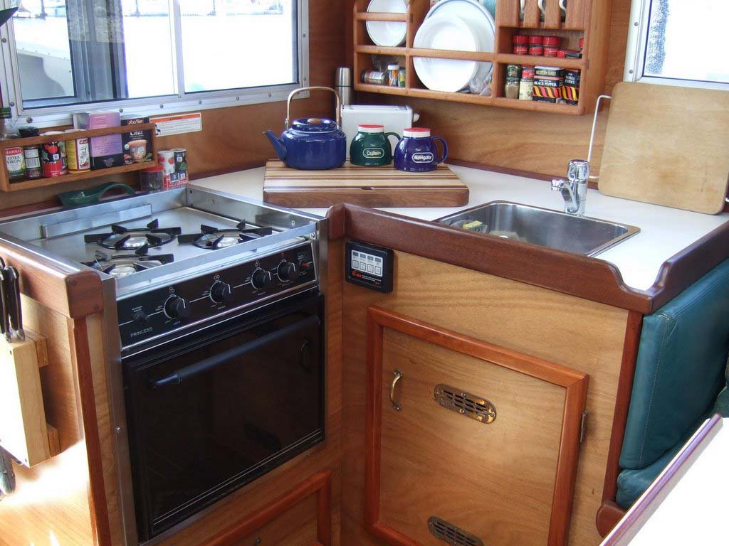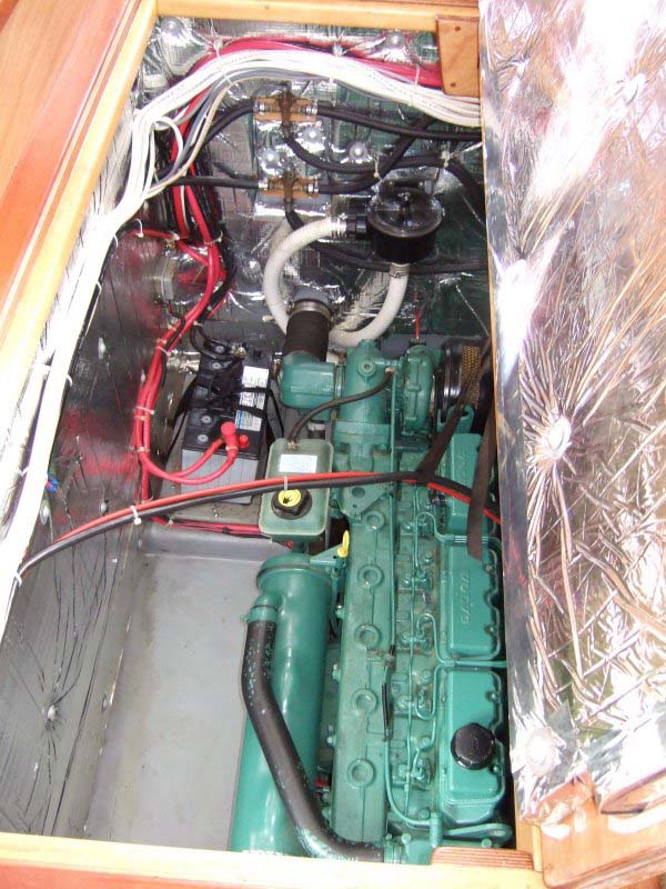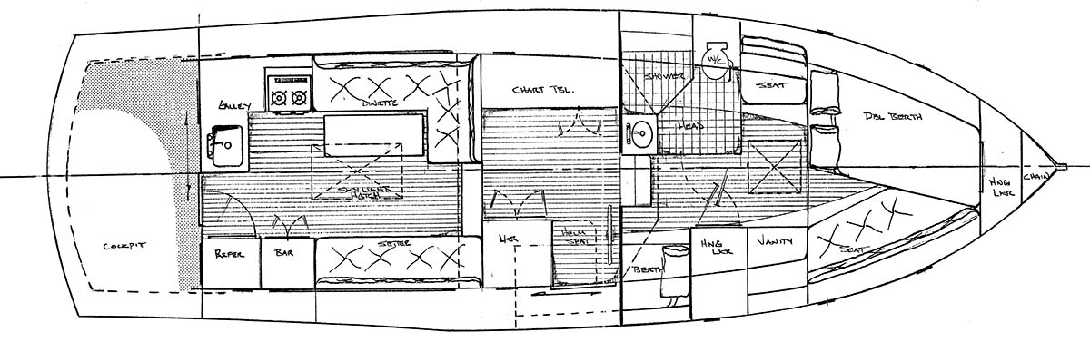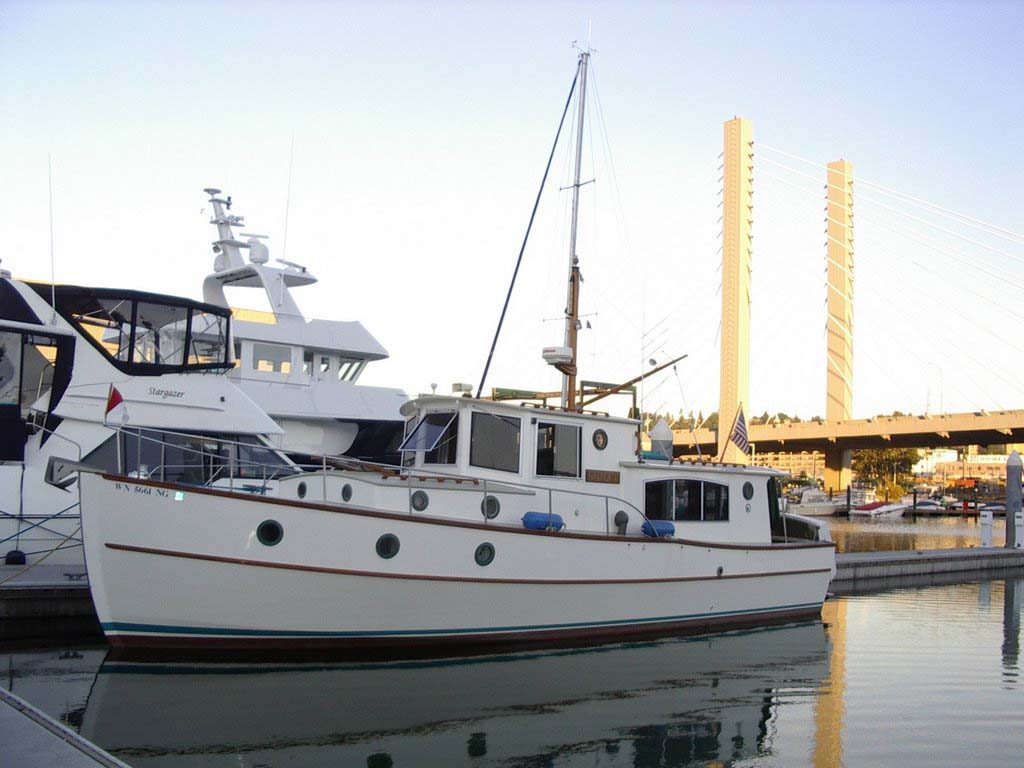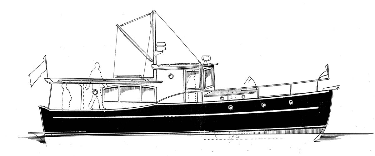 Here is a power trawler of a size large enough to spend a lot of time on cruising or even living aboard yet handy enough so that a couple can easily handle her in any conditions she might encounter. With a high visibility pilothouse and a covered after deck, it’s clear to see her Northwest heritage. This could easily be the boat to cruise comfortably to Alaska and back or just knock around Puget Sound. We have chosen a hull that performs very well with medium horsepower and put steady economical miles under her keel without needing a fuel barge to link up with her every few hours. Power is to be Volvo-Penta’s 41 series diesel of 185 hp. with fuel consumption of about 4 gallons per hour, a cruising speed of 10 knots, and a top speed of 13 knots. With a single diesel for her main power plant, dockside maneuvering will be aided by an electric bow thruster. The engine room is below the pilothouse sole and can be accessed through a door in the fo’c’sle or through lift up hatches in the pilothouse floor. Fuel tanks are port and starboard in the engine room under the side decks and the whole space is sound insulated and brightly lit so that maintenance can be as comfortable and convenient as possible.