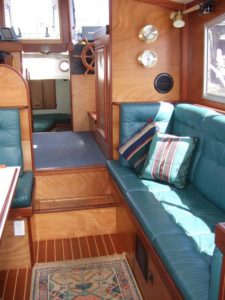 Going forward into the fo’c’sle, you will encounter a head to port with enough room to maneuver in without feeling cramped. There is a separate shower stall and both the head compartment and shower drain into a separate sump. Cleaning is largely as easy as hosing them out with hand held rinse spigots. There is a quarter berth to starboard for that occasional guest that might come along for a cruise. Forward of the quarter berth is a hanging locker and a vanity or personal work desk on the starboard side. Forward is a large double berth and a couple of reading seats. I favor the concept of providing plenty of nesting spots so to allow one the opportunity to relax in quiet seclusion when its needed. The Gollywobbler has been designed with that in mind.