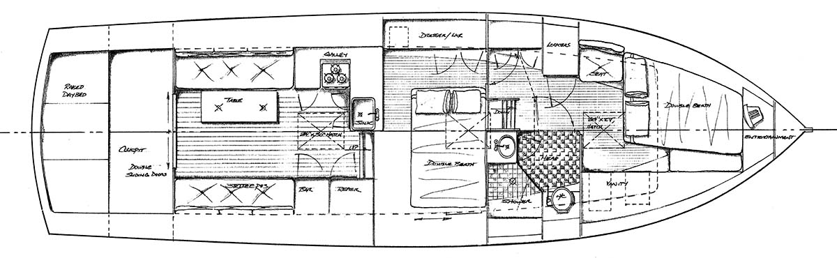 The primary concern here was to move the engines aft out of the people spaces of the boat and into the stern. Using the concept that we tried successfully on the Topknot 32′, I have moved to a stern drive diesel configuration. I have specified using twin Volvo 41 series stern drives. They have 185 horses each and fit nicely in the stern with a space for generator between and the daybed concept over the top. This will allow some sunbathing room in the cockpit of the boat and should be comfortable when using the cockpit after a days worth of cruising. A barbecue could be run on the daybed platform and with a couple of comfortable deck chairs under the covered cockpit, you can relax out of the weather at the end of the days cruise. The main salon itself has better lounging areas and better communication to the galley area. Note that the bar and refrigerator is opposite the sink and range areas of the galley. There is also a nice skylight over the galley, which gives us enough room for a 9’3″ Guppy sailing dingy over the main salon roof.