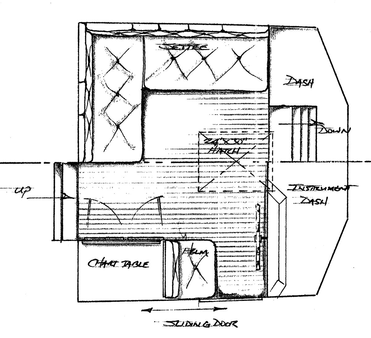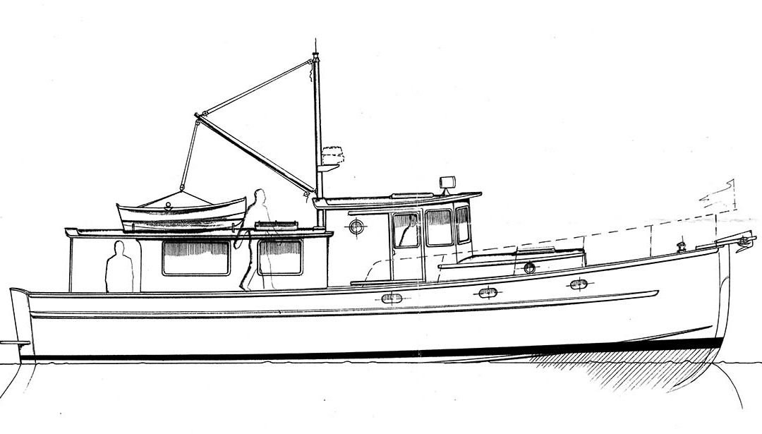 Going up a few steps into the pilothouse, you find a chart table and helm area to starboard with a sliding door for access to the fore deck. On the port side, an “L” shaped settee will allow plenty of comfortable seating for the peanut gallery critiquing your navigation. Going below forward into the fo’c’sle, you find the head is to starboard and has enough room for all of its functions, especially at the water closet area. The enclosed shower is through a doorway and has a curtain to keep spray out of the head area proper. Opposite the head area are lockers and a swinging door accessing the guest cabin below the pilothouse proper. There is full 6’2″ headroom below the “L” shaped settee and the large double berth is athwartships with lots of storage room both hanging lockers and drawers. Your guests won’t have any problem staying comfortable here in this cabin with the only small privacy issue being the use of a common head compartment for the two cabins. I’ve provided a slide out pocket door at the front of the head bulkhead which would allow the fo’c’sle cabin to be private to the coming and goings in the head compartment in the day and evening.