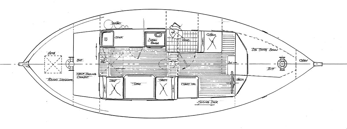 The smallest in our fleet of heavy “Workboat Type” designs, this double-ended full displacement power cruiser can hold her own in most any weather one can encounter. Her heavy hull takes the waves like a duck, and with a small economical diesel she can cruise for miles and miles. This would be a wonderful cruiser for a couple that just wants to step on board and set off for months at a time. Whether its cruising the Labrador coast or the Inland Passage to Alaska this little boat can handle just about anything Mother Nature can dish out. Range is more than 800 nautical miles and comfort level is high if you just don’t confuse things with too many passengers. She has berthage for three, an enclosed head, and enough deck room to carry one of our 9 foot 6 inch Guppy sailing dinghies. I can just see her waiting on a mooring loaded and ready to set off for the summer’s adventures. — Sam Devlin