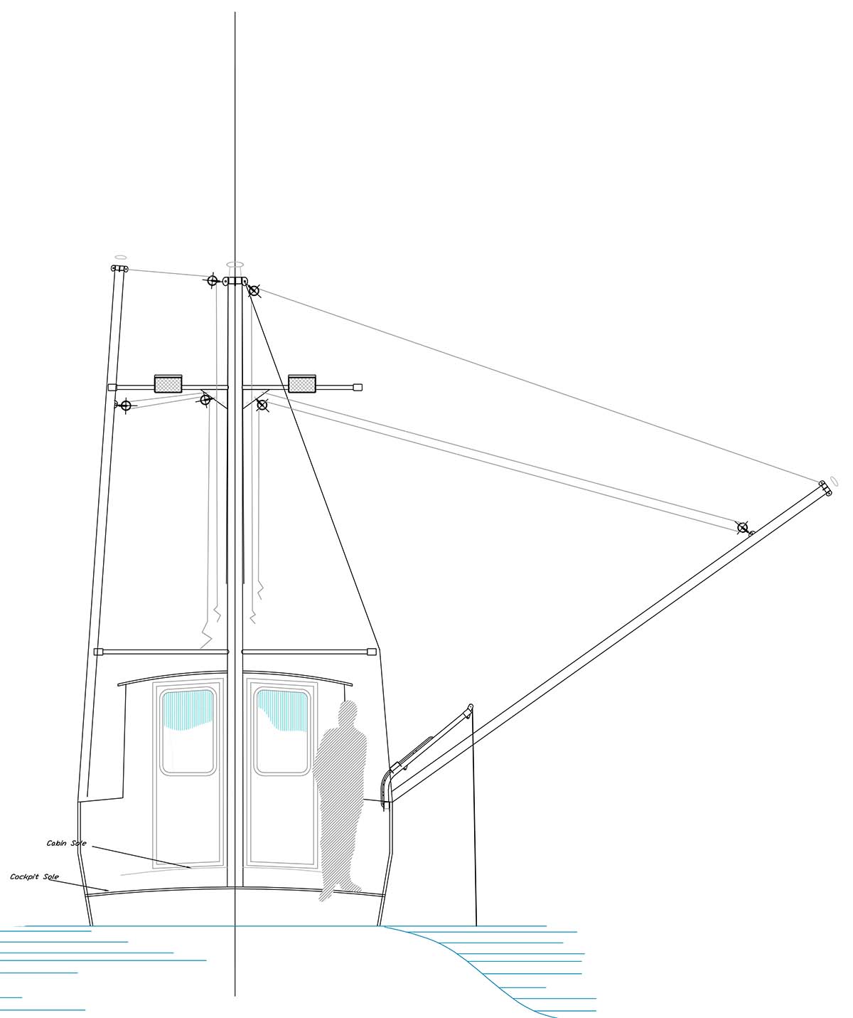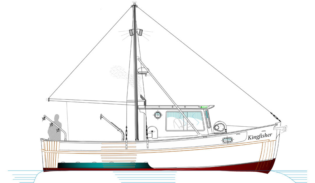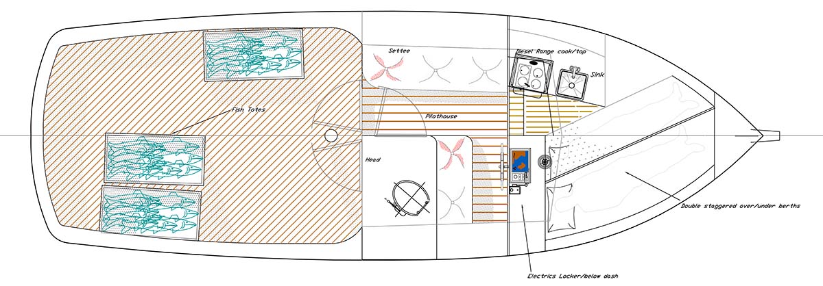 So let’s take a closer look at the Kingfisher design that I came up with. She is not a huge boat at just over 30 feet in length but with that utility of staying close to the mothership, she really doesn’t need to be much longer and therefore have good fuel economy and seaworthy comfort for the crew. She can be rigged for either hand trolling (non-powered gurdies which control the lines for bringing the fish into the boat) or she can be powered with a small hydraulic pump that would run off the engine and can be rigged as a power troller. There are twin 18 foot long trolling poles on either side of the single mast and these are lowered to about a 45 degree angle off the port and starboard sides of the boats helping to keep the fishing lines out of each other’s way. They can also be used to set small paravanes for running when the weather is really snotty and these simple gear additions can really make the difference between just a crappy day and one that could provide you with real story fodder. If you are anything like me, even though I like a good story, the older I get, the less I desire to experience those “really good” story days if you follow my drift. Anyway, the paravanes work very well at allowing the boat to continue into waters that might really blunt the progress of an unstabilized hull.