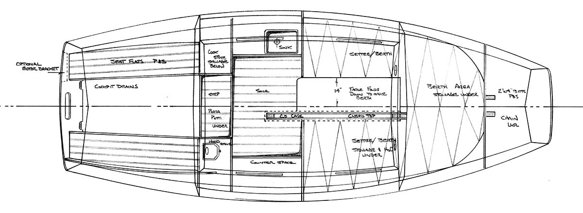 Interior accommodations include a large forward double berth, followed by opposing settee berth (centerline table attached to the centerboard trunk folding down to make even more bunk area.) To port is the galley, complete with ample workspace and storage, leaving the counter space uncluttered and visually pleasing. To starboard is a built-in wood stove serving as heater and dryer for wet gear. The portable head is under the companionway step. The most striking characteristic of the interior is the feeling of space and the visual freedom the large ports give you to view the beautiful scenery outside. — Sam Devlin