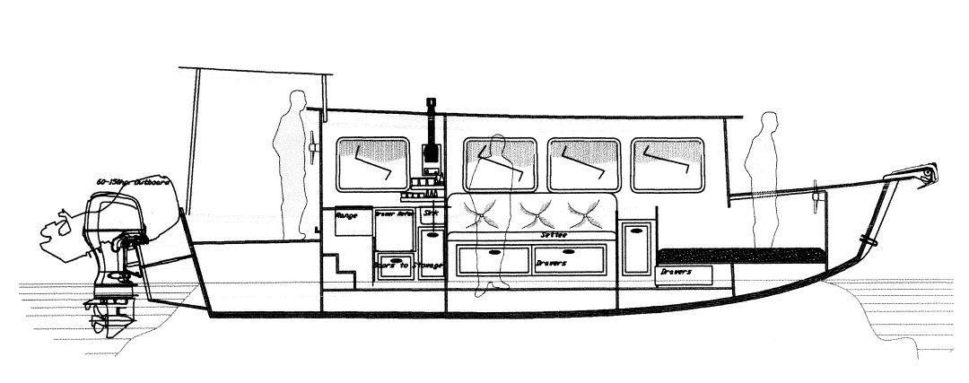 We’ve had some fun with this one. What a great length for a houseboat! We’re providing this concept drawing hoping someone will be excited enough imagining with it to commission Sam to complete full construction plans for this very swift and sleek houseboat.