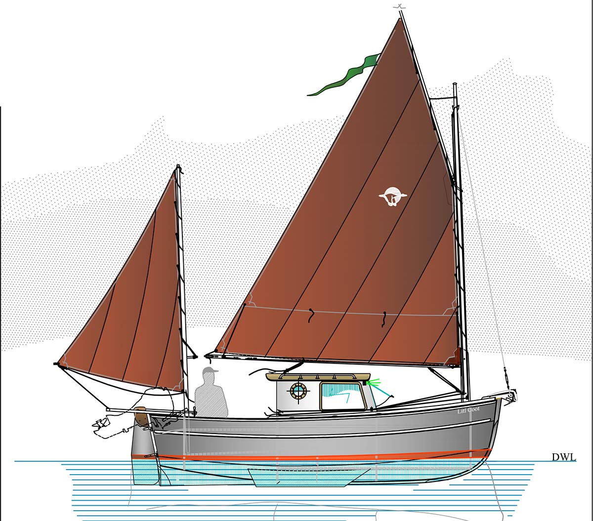 One of the main ideas with this design is that all functions could be done while sailing, or motoring, solo. There is room to take a buddy along but you don’t necessarily have to, in fact there might be a lot of days when just my dog “Bella” might be the perfect crew for an adventure on the “Litl Coot”. So all the halyards, topping lifts, etc. are lead aft to the sides of the pilothouse. With her little mizzen sail set up and left rigged most of the time either under sail or under power, she will have the wonderful capability to have a balanced helm under different wind and tacking conditions, and the mizzen would help to keep her steady on a mooring, or at anchor when holed up for a rest.