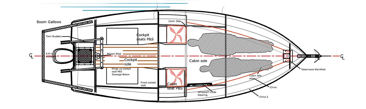 Amateur plans are $195 and consist of 16 drawings printed on 24X36 inch paper and a simple building booklet. You can either buy printed sets of plans directly from us or buy a download version and print on your own. We are now producing basic hull kits for her or we could build you the whole boat if you would like, and very soon I look forward to seeing many of these little Cat Yawls on the water. — Sam Devlin