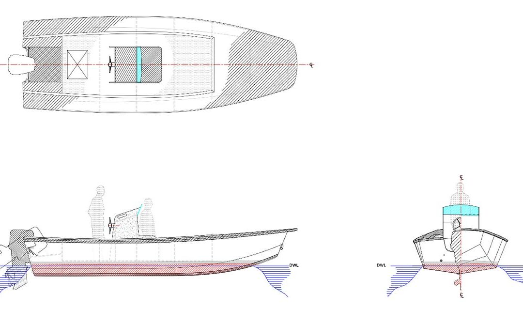 A center console rounds out this design but you could work out many different arrangements for passenger seating or even fit a removable small cabin on her like the Honker 18 design. A concept drawing for a Little Cod 21 houseboat is included in the study plans. With enough interest or a build commission, we could definitely flesh out the remainder of the houseboat’s plans. – Sam Devlin