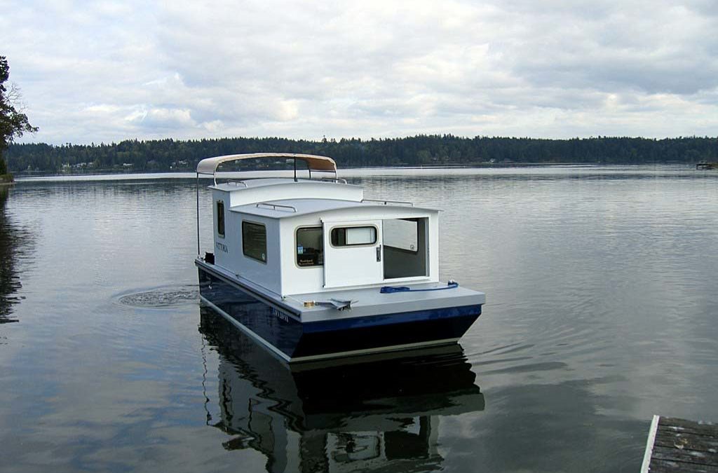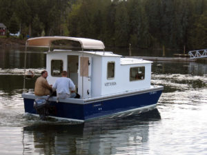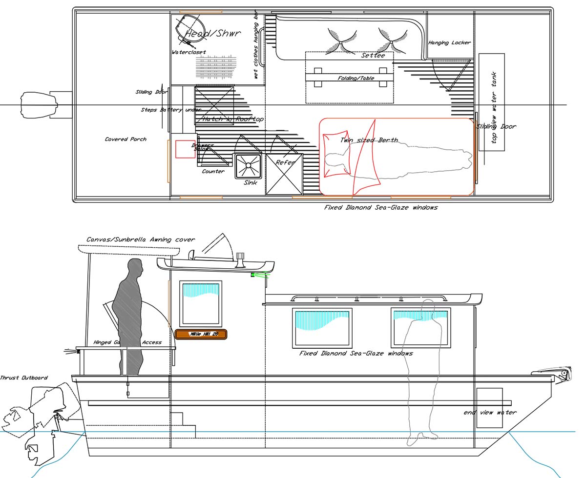 Update – 2008: After many years and several boats with our old venerable design called the “Millie Hill”, we set about to see what might be done to improve on the older design and build the smallest houseboat/shanty boat cruiser that might be possible to live aboard… and right about that time, along came John Zummo looking for a simple live-aboard. He was living in Friday Harbor Washington at the time and needed more space than the 26 ft plastic powerboat that he lived on could provide. So drawings were dusted off and sketches flashed back and forth in emails, and before long a signed check for down payment was in my hand and was quickly deposited in the bank to start construction. A very simple boat was proposed with a deeper hull than the old “Millie Hill” design and more established room for the twin sized bed… John and his dog would be mates on the new boat and they eventually decided to reside in Olympia, very near my shop.