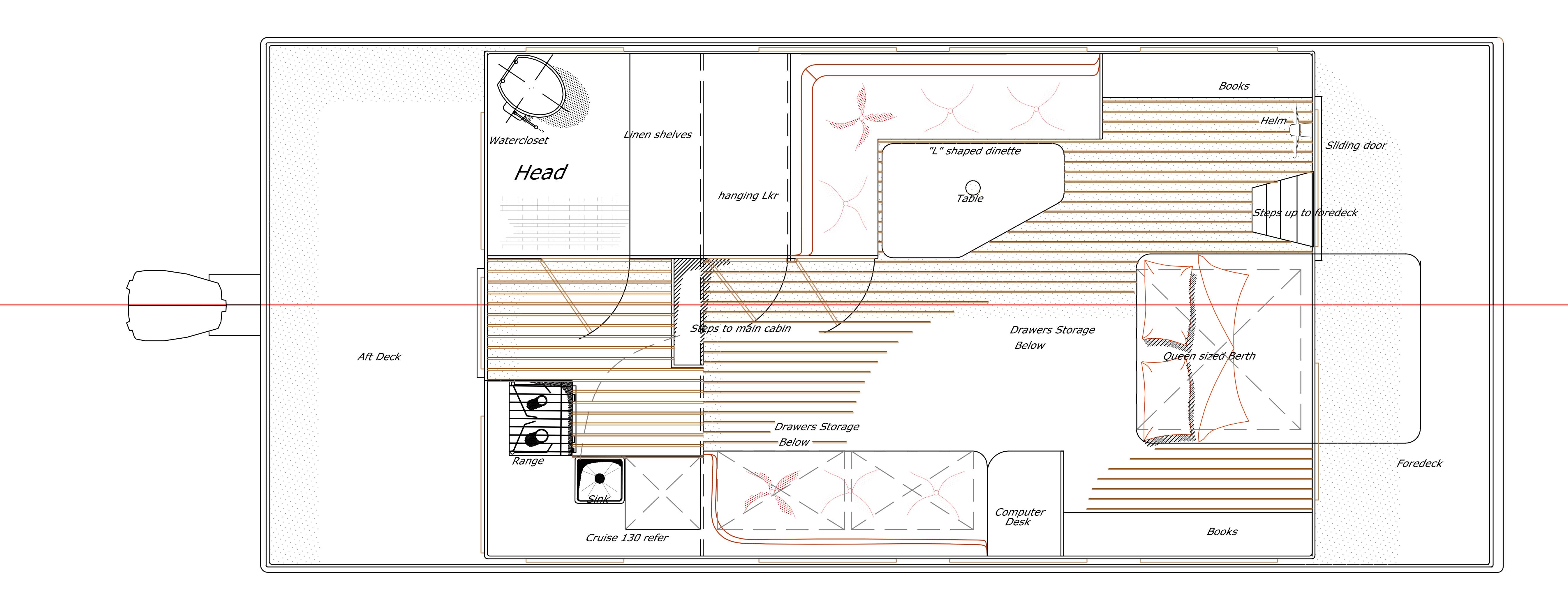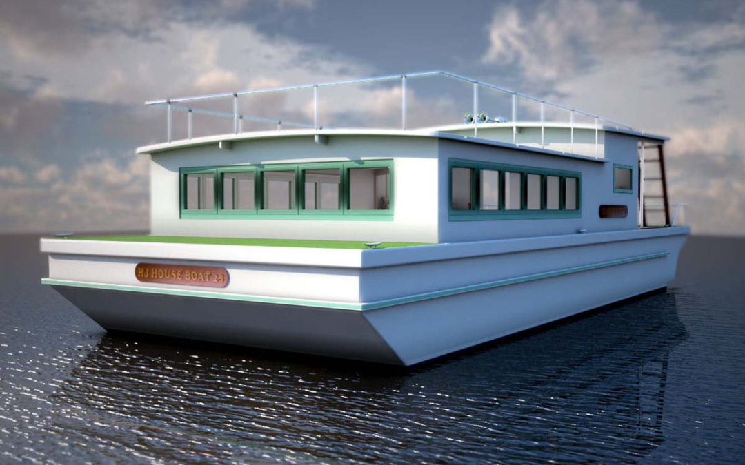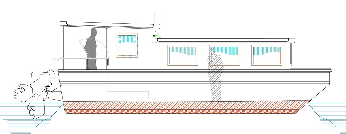 A good friend and boatbuilder in Korea commissioned this design. It followed some correspondence that we had about a preliminary design on the same concept done originally in 25ft. of length with a 10ft. beam but we quickly realized that if we really intended this to be a potential live aboard “Shanty Boat”, that some extra length and beam would pay dividends and give us much more room to work and live with and we quickly landed on this 28 ft x 12 ft version.
