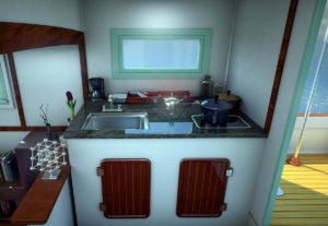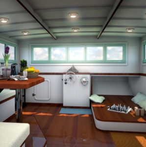 But it is the cabin with its volume and spaces that really is the attraction of this boat with all the functions of a normal home — kitchen, bath, lounging, sleeping, stowage, bookshelves and entertainment center. If you really fancy living off the grid, a simple little gas or diesel generator could be fitted that would allow her to be fully functional and self-contained, but she also would be fitted with shore power connections that allows you to hook up to electrical at the marina. It is also simple to hook up to marina pressure water making her a completely functional floating home. The Millie Hill 28 has a full sized queen bed that can be arranged in a couple of ways and with both sides of the bed accessible, it’s ready to crawl into easily and comfortably. There is a full dinette that can seat 4 adults for a meal and with the opposing seat/couch, you can find yourself with a couple of possibilities for settling in for the evening. Stowage is built into the bases of these seating areas, always with the thought in mind that there seems to never be enough space for stowage on a boat. There are little bonus areas also — a computer desk on the starboard side that allows a space for this very vital function of modern life and a hanging locker on the port side. There is a shower in the head compartment and if desired, there’s even room for an all-in-one washer/dryer to be fitted into the underside of the linen stowage area in the head. Virtually every function of the normal home can be accommodated but most importantly, you can move the Millie Hill to wherever you desire which is really the key to this platform. There might be many hundreds of options of how you configure your own interior or set her up but the footprint of a bi-level cabin, with boarding area in the stern and the possibility of moving her about either under her own power or with a tug tow, is not to be understated. — Sam Devlin