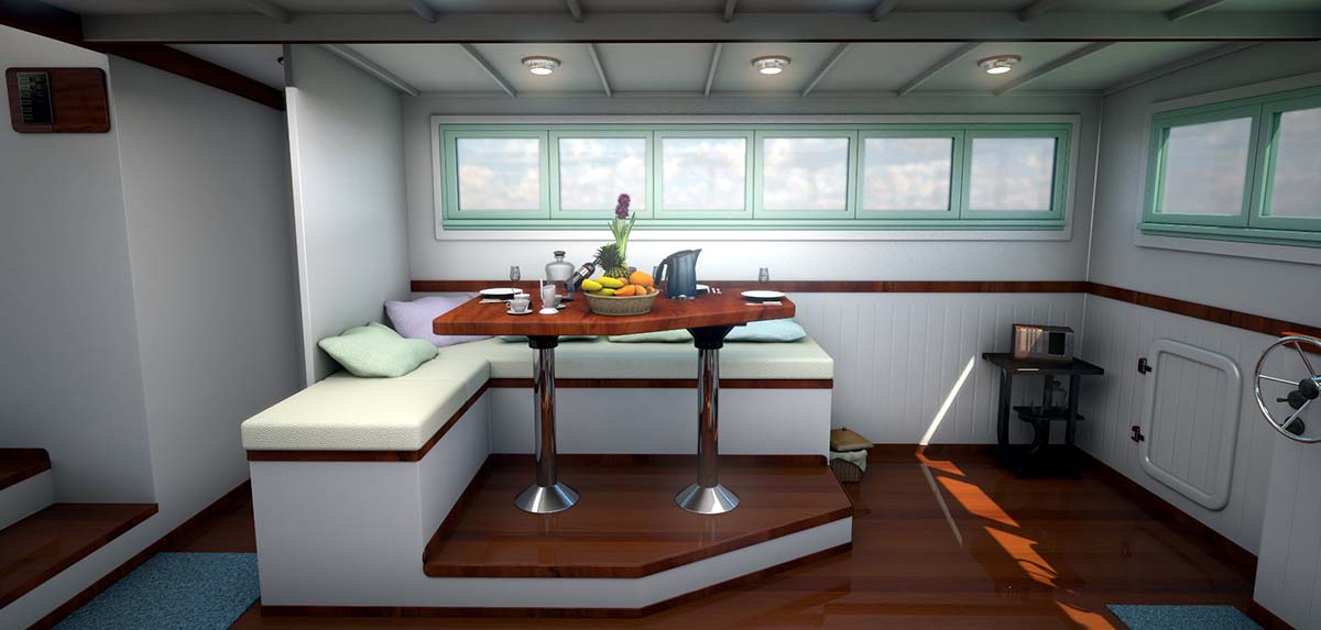 She has a good amount of space on her covered rear deck. This deck is at a lower level closer to the waterline which helps make boarding and exiting the boat easier and also allows us to sit in the shade on a warm day. If you fancy doing a bit of sunning, you’ve got a couple of options — either the fore-deck or it wouldn’t be all that difficult to climb up onto the foreward cabin top for a view of the world that would be unmatched.