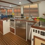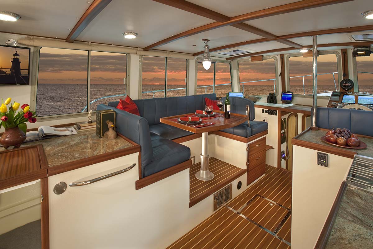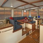 Back up in the main salon, the galley is to the starboard side and has the shape of a large “U” — the freezer and refrigerator are below counter, drawer type units and a trash compactor, sink, and a 4 burner range with oven complete the suit plus there are gobs of drawers for dish, silverware, pots, pans and all the other items a modern boat need to stow away. All drawers have sea-locks on them — simple swiveling tabs that lock the drawer into closed position and hold tight even in a tough sea-way. Opposite the galley is a “U” shaped dinette that can seat up to six with comfort with a varnished table of Bubinga wood that finishes out the dining area. Forward of the settee is the co/helm seat with the back being convertible from either the use for the settee or the use for the co/helm. Electronic instruments are on both the helm and the co/helm sides with the co/helm person able to help monitor the progress of the vessel or scout ahead for safe anchorages or obstacles. Lots of counter space behind the front windows allows the spreading out of charts or tide tables while underway. On the starboard side is a large helm area with full instrumentation and a helm seat that can actually seat two side by side if desired. More drawers and stowage spaces are festooned around the helm and co/helm area providing organized stowage of all items.
