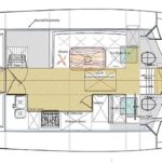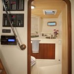 Clear up forward ahead of the queen sized berth is the chain locker — it’s divided into two sides and the Moon River can carry 150 ft. of chain and 250 ft. of line anchor rode. Immediately above is a Lofrans anchor windlass and deck wash system.