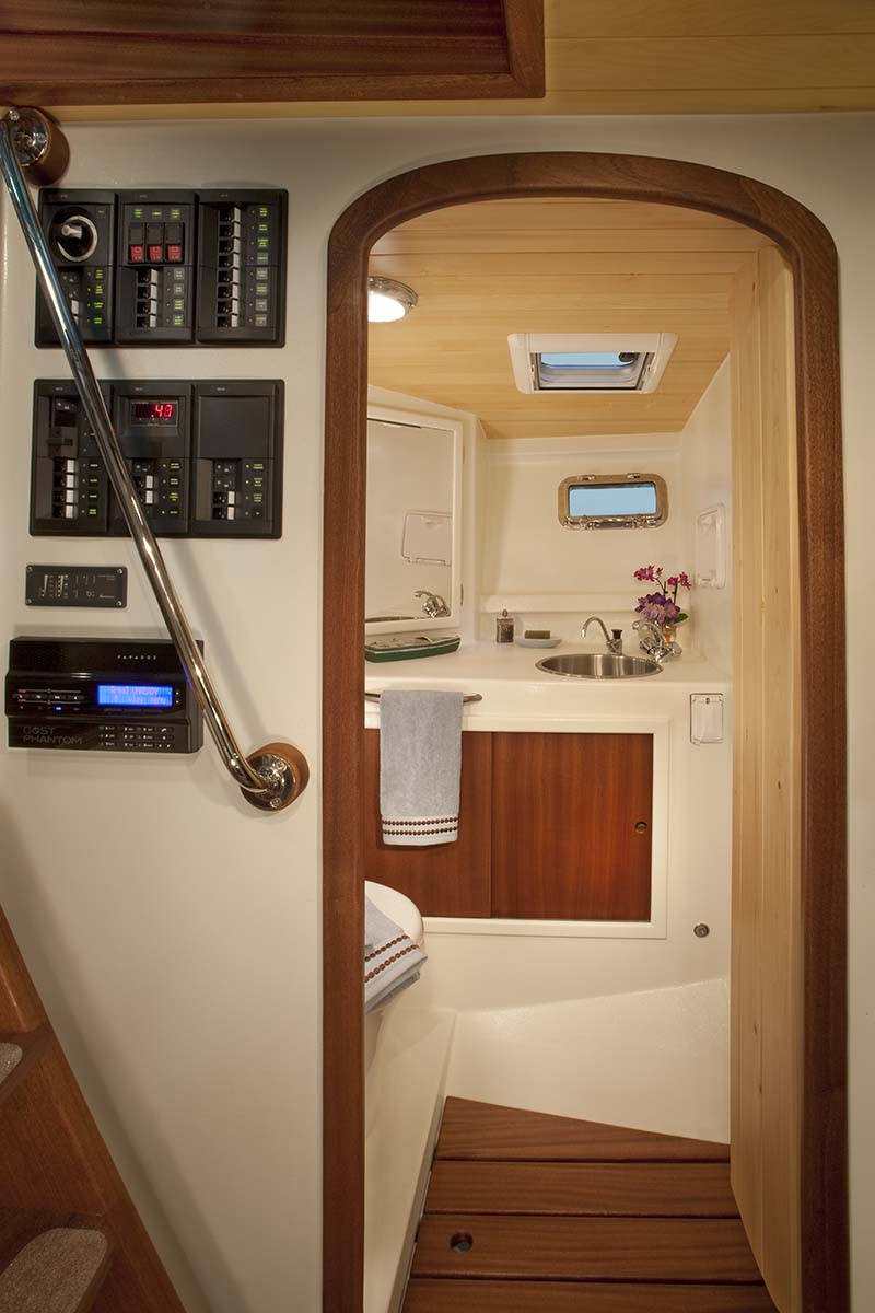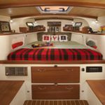Moving forward is the centerline door to the main cabin with the galley immediately to the starboard side of the boat and on the port side is a large bureau top cabinet with hatch and door in it. This is the access to the second stateroom and by opening the hatch and swinging open the door, a ladder can access this area. There is a generous berth outboard in the space, locker room for duffels and hanging clothes and just below the cabin sole on the centerline of the boat is another single berth. This aft stateroom has a generous almost 7ft. headroom and is painted in white paint with mahogany wood trim and it looks clean and comfortable. Ventilation is provided by a larger hatch that opens into the cockpit of the boat just above the top of the engine box. There is also access to the main systems area of the boat either from the single berth under the centerline or thru another flush hatch in the main sole of the salon. Located in this space are the pumps for potable water, blackwater pumps, centerline water tank, inverter, Glendinning shore power cord basket, battery charger and more. This space is well lighted and completely finished with our traditional Devlin finishes. In fact, one of the things that we are most known for is our finishes with every part of the boat being an example of our simple but elegant finishes with all construction done to the highest level of quality and finish.