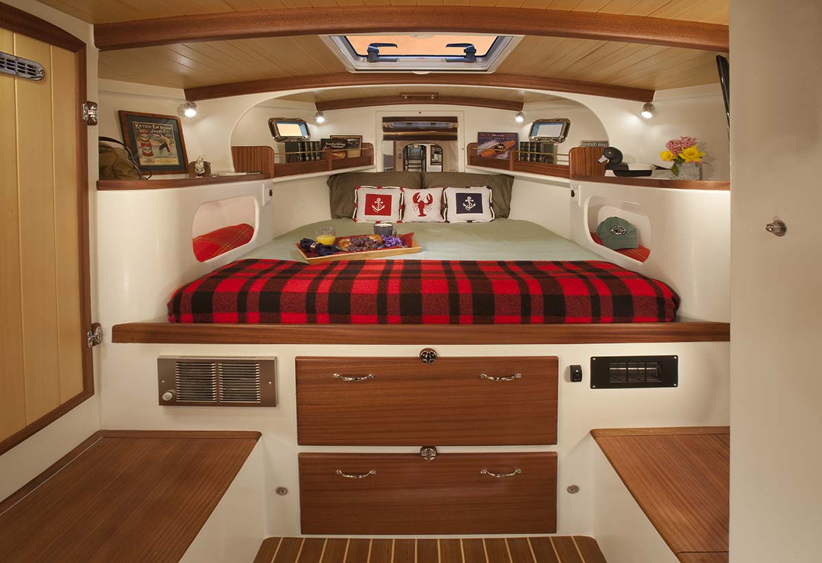 Going down 4 steps into the focsle of the Moon River, you see the master head to starboard with full shower stall and on the port side an almost mirror image of the master head except for the shower stall for the crew. The doors to the two heads are arranged to be convenient to either using from the main salon for the crew and for using from the master stateroom up in the bows of the boat for the master head. A large door leads into the master stateroom forward with full island style queen sized berth forward and hanging lockers port and starboard for both the skipper and for the first mate. This is a spacious and light and airy feeling cabin with beautiful Alaska Yellow Cedar tongue and groove overhead and Yellow Cedar and Mahogany trim for all doors, drawers, fiddle, deck beams etc. The forward stateroom also has a large 28”x28” hatch in the ceiling with screen system on it for privacy.