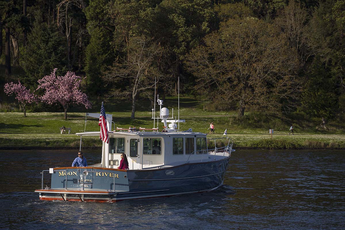 She is also very docile around the docks and in tight quarters as she has the maneuvering ability of her twin screws to help the skipper out and with proportional bow and stern thrusters, you can really make her do virtually anything that you need. The 360 visibility from the helm is extraordinary and with tiny little adjustments to either the props or thrusters, it really is a low stress way to be on the water. One of the great virtues of a sedan type cruiser like the Moon River 48 is that the windage is low — there is plenty of boat in the water and not so much area above the water that the wind can push on. Really, she is a very pleasant boat to use.