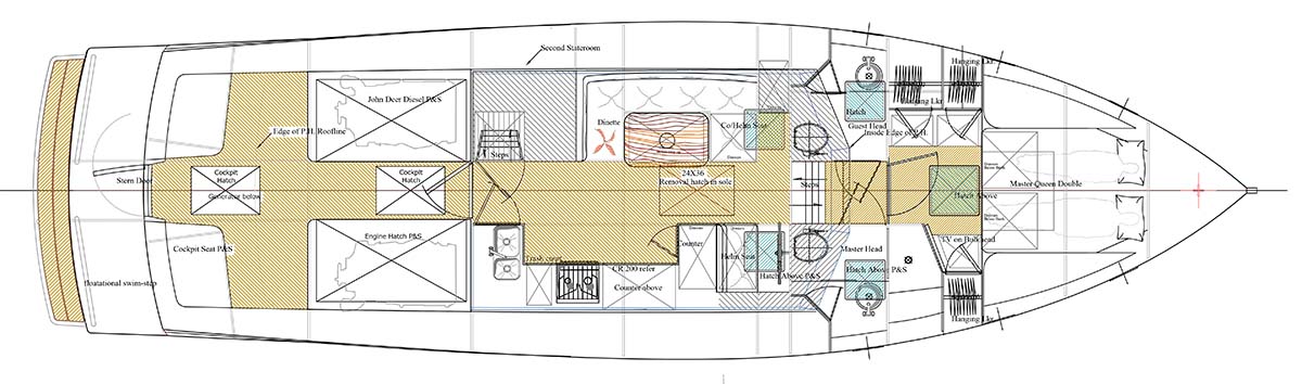 So let’s take a written tour through her and see what she has for space and accommodations. There is a floatational swim step on her rear with the level being just perfect for stepping onto the boat from a dock or from a dingy. There is mid-calf height 2” diameter stainless steel railings (staples) on the back of the swim step to help keep you centered but this is a 36” wide step and there is no lack of room or any feeling of insecurity when you step aboard. The cockpit is entered thru a door that hinges on the back of the transom and stepping up into the self-bailing cockpit is easy and secure. Stepping up into the cockpit you will notice the large cockpit area is half covered with a roof extension of the house with a couple of wide seats in the immediate back of the cockpit that allow the sun worshipers to stay happy and two almost 7ft. long seats port and starboard under cover of the roof extension for those passengers preferring shade. These covered seats are really the tops of the two engine boxes and with electric motors to raise them it is just the matter of pressing a couple of rocker switches and the engines are exposed. Between the engine box seats on the centerline cockpit sole is a flush hatch that if opened exposes a larger area between the engines. All access for checking oil, checking the water strainers, changing oil, and shifting fuel from one tank to another is done from this area. There is a ladder leading into it and everything is here from tool box stowage to spare oil soak rags, right at hand and well lit from a total of 8 lights — easy to get into and back out.