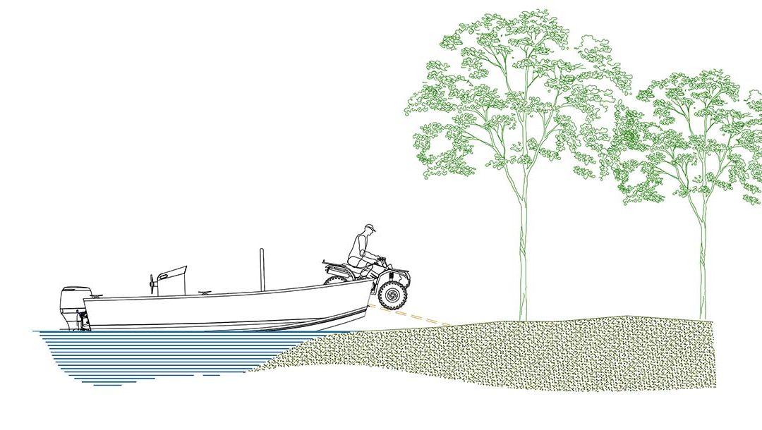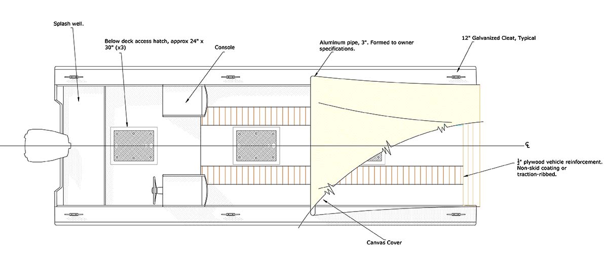The whole concept of the Mud Dauber 23 is wrapped around the goal for her to be the quintessential beach boat. It’s the boating equivalent of carrying a good knife, a Leatherman, and a whole box of good tools. The Mud Dauber can take you to wild remote beaches and can haul the gear and supplies necessary to keep you well occupied with these voyages. She is high sided with a bow platform that has removable boards that can be configured to build a bow ramp and you can beach her and unload without hurting your back. Even a tractor or small sawmill could be carried and unloaded if that is something you might want to do.