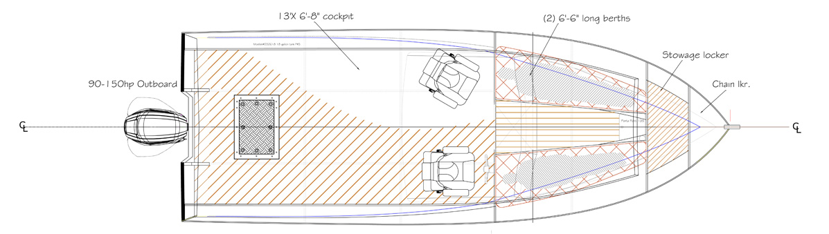 So it is that Chris had a tough time convincing me to rework Sea Chaser. I also wondered if we were to develop a new design, why would we draw so heavily on one of my older ones? But, when Chris showed me his sketches and pointed out that precious few good pocket lobster boats are being built today, I came around. I have to say that I’m pleased with the results, and Chris tells me that he is, too.