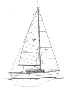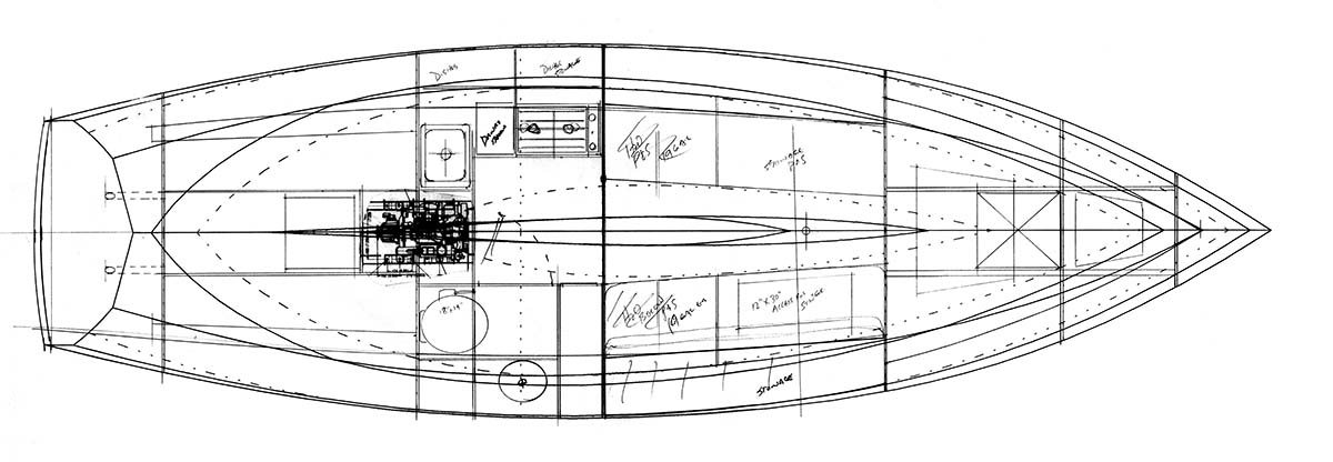 As you look at the sections, it’s not hard to imagine her as a round bottomed hull with some defining laps. The laps are, of course, plywood panels, and she is indeed a stitch-and-glue composite construction boat. We have taken the dimensions of a small but capable off-shore vessel, with an outboard rudder and inboard rig contributing to her simplicity and seaworthiness. She has what I consider to be my favorite type of interior, with the galley to port, head to starboard and a graceful trunk cabin providing 6’3″ headroom. Forward are the port and starboard settees with comfortable seating for all my guests. A cabin table can be fitted that’s attached to the mast, an option available to the user. Forward is a large double berth and a chain locker in the bow. A foredeck hatch can provide ventilation and some handy sail-handling access.