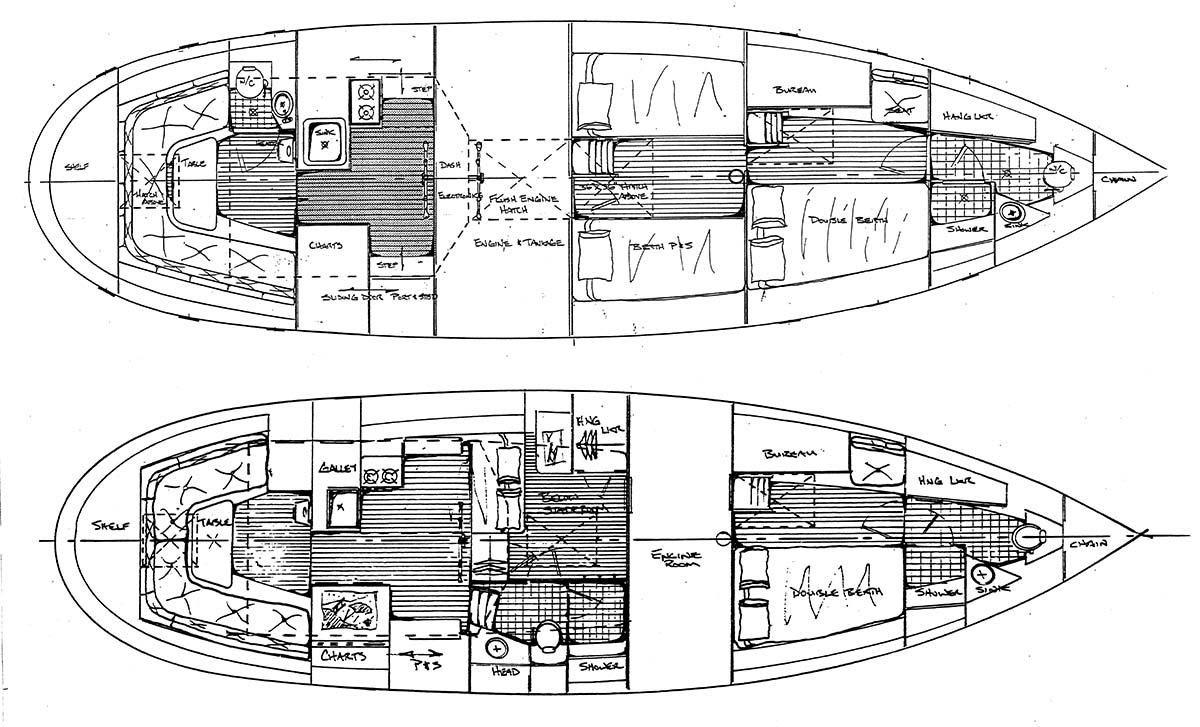 Power can be either twin small diesels of 50 hp each, or with one large single diesel of 100-120 hp. My own choice would be twin 4 cylinder 50 hp diesels as the maneuvering edge gained by twin engine installation more than justifies the small additional cost. And while motor-sailing, the lee sided engine can be left running which helps keep the shipboard electrics in shape.