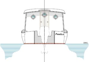 Moving forward, the galley is to port with a hanging or storage locker on the starboard side just behind the helm seat. The whole idea of this type of cruising is so very different than the saltwater type of cruising that I am more used to. Here the boats need helm and co/helm seats configured so all can face forward and help the skipper see obstructions in the water and help with navigation. In the waters where Pamlico will make her home, the importance of having facing forward seating is diminished and the importance of other deck and lounging areas increases in value. Headroom in the houses is 6’-3” minimum and there is the feeling of room, space and great visibility from the house areas. Windows can be done as hinged or sliding types to keep lots of air moving about the cabin. Keeping the boat and its systems simple is really one of the keys to keeping her loved and used.