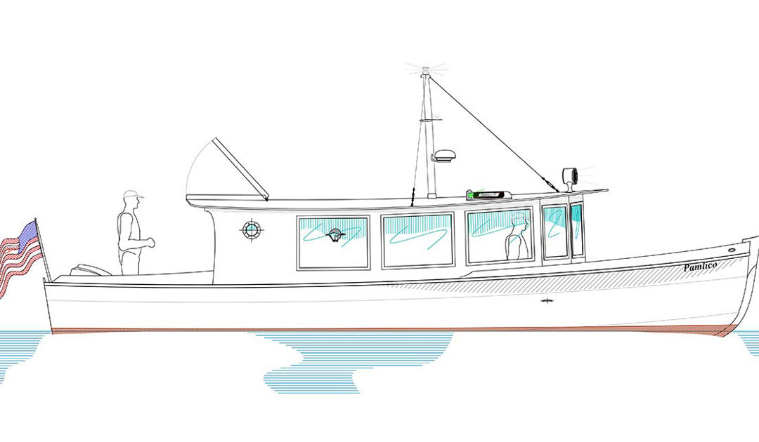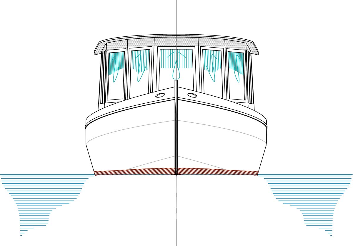 The Pamlico design was commissioned by Bruce Mierke, an accomplished and very skilled boatbuilder from the shores of North Carolina, for his own use as a potential stock model design that his shop could offer and as a vessel he’s dreamed about for his own personal use. She is really nothing more than a shallow water cruiser that almost serves the function of being a live-aboard boat. Highlights of the design are bracketed around the hi-thrust 60 HP outboard that should be more than enough power to allow her to run at her maximum hull speed of 7.5 knots and most likely be capable of providing her with bursts of speeds to 10 knots when called for. She is long and lean and will move thru the water without much fuss and or wave making action, an attribute that helps keep neighbors and other boaters in good spirits. The outboard is done in a semi-well type configuration which serves the purpose of allowing the outboard to be somewhat sheltered from the side view and when rotated to the lock up position, it does not allow the lower unit to extend beyond the end of the boat very far. You would be surprised at how often outboards get banged up by extending beyond the ends of the stern of the boat. The cockpit is 7’-2” wide and 5’-3” long and has room for a couple of folding deck chairs while still having enough space to move around. The side decks are only 6” wide back here and with the cockpit coaming extending up beyond the decks, they won’t serve the dual function of seating but there always are the two sponsons on either side of the outboard that can be sat on if necessary. One of the really neat features of the Pamlico design is that she is not restricted to just the aft cockpit area for socializing as she has a bow cockpit also. This one measures about 6ft long by 6ft wide, obviously narrowing at the bow, and is accessed by a hinged door on the front of the pilothouse. A bow facing cockpit like this works on the calm and protected waters that the Pamlico 32 was designed for but it would not be a feature I would look forward to on the more boisterous waters of Puget Sound or waters north. We tried that on the Czarinna 30 design years ago, originally built as a cruiser for Lake Union waters in the middle of Seattle, Washington but she was resold into the application of being a cruiser and she was very quickly converted to a flush raised deck type boat. The forward door would never seal up like I wanted and when running her in any kind of a sea, inevitably some green water would lap over the bow and squirt disconcertedly into my lap at the helm. But in this application, cruising on rivers and the protected inlets of the Carolinas, the Pamlico’s arrangements will work really well and allow us to have passengers on the bow deck, looking out at the waterways well separated from the outboard at the stern of the boat. With a cool breeze in the face, the day is always more pleasant.