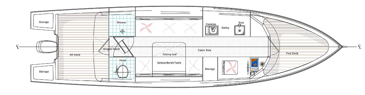 Moving from the aft cockpit into the cabin of the boat, there is a hinged or sliding hatch in the overhead allowing crew to walk upright forward into the cabin without ducking into a doorway but there is a single step down to the cabin sole level. In the aft area of the cabin, we gave her one of the features that win high marks from customers and friends with a head to the starboard side and opposite the full headroom shower compartment on the port side. With the doors opened, there is room for dressing in the morning with privacy standing in the middle of the boat and with a full length mirror on the backside of the head door, you can run a comb thru your hair and look very presentable before the rest of the crew sees your morning face. Just forward of the head on the starboard side is a fore and aft dinette with room to seat two but by adding a folding leaf to the table, there is space to seat another two on the portside settee itself. The same settee can be used as a day bed type lounging area if one is inclined to take a quick nap in the afternoon and with the table hinged down on the starboard side, the sleeping areas are defined port and starboard. With some cleverness, the portside settee can be built as a slide out type configuration which would make up into a queen sized bed but Bruce insisted on not needing this feature in the plans. His statement about that was if the customer needed that feature he could certainly work that out on his own which is one of the benefits of working with an experienced builder.