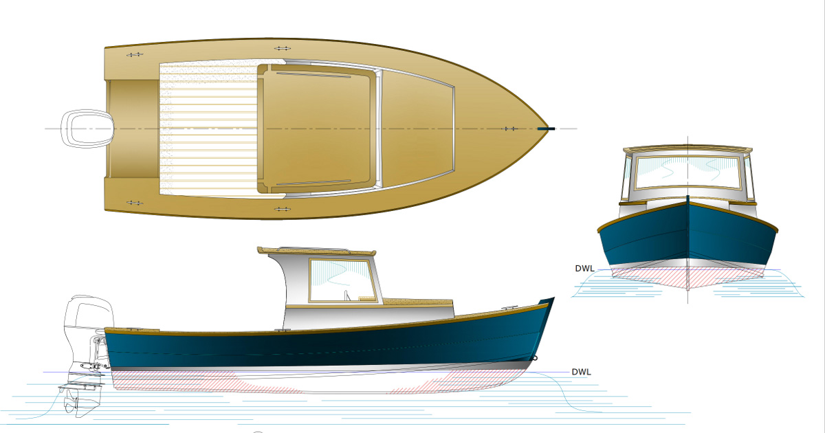 Sam Devlin has a reputation for designing really eye-catching “character” boats. Perish the thought, but I’ve even heard them described as “cute”. Because of that, they are often underrated for their utility, sensibility, durability and performance. The Pelicano is a really excellent example of a comfortable, practical medium-sized skiff that really looks spectacular. The Devlin Pelicano is a versatile and useful real-world design because Sam has designed three separate “flavors” on the basic fast, comfortable and rugged Pelicano hullform.