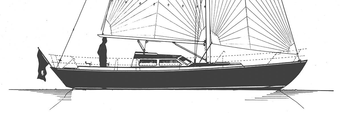 The Peregrine 36 will be built in wood epoxy/composite with the stitch and glue building method. She is multi-chined and in section presents almost a round bottom. The keel is a fin type with Stainless-steel fin and lead bulb at the base. With six foot draft the keel will help hold this relatively narrow boat up to her sail plan. A 15 hp. Yanmar diesel saildrive engine will help out when the wind is being finicky, and with a hand held autopilot control night watch within the confines of the raised doghouse or under the dodger will be much more pleasant than on the typical boat fully exposed to the elements. The Peregrine 36 will be built with high grade marine plywood with the hull skin coldmolded to a thickness of 1” and with an additional coating of epoxy resin and glass cloth sheathing for the exterior she will be a tough but beautiful boat. With her varnished mahogany interior and dark green leather cushions balanced by a beautiful shaped exterior the “Peregrine 36” should fairly take ones breath away with simple elegant beauty. — Sam Devlin