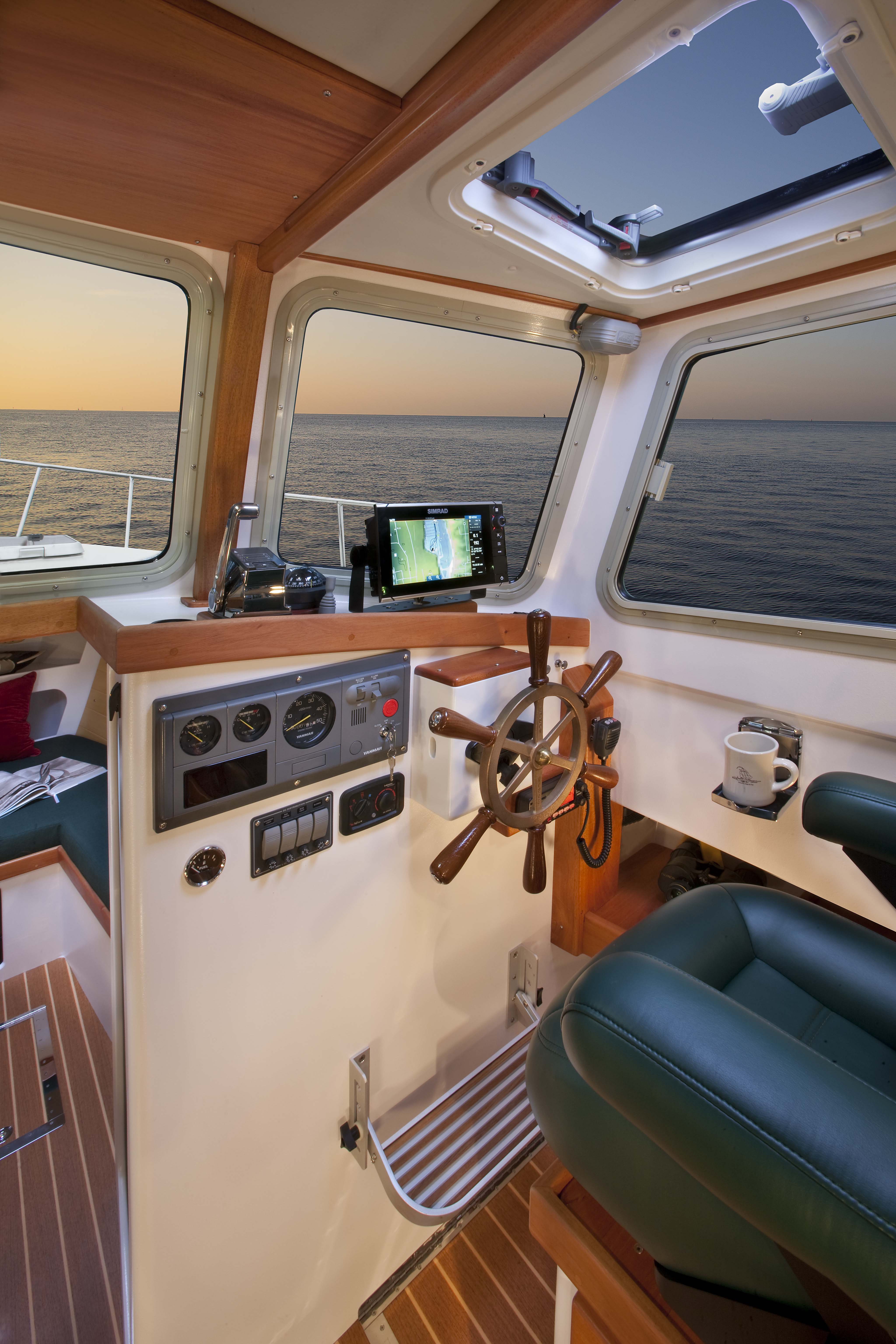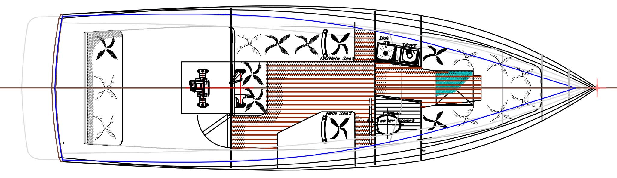With those requirements set down, I had no hesitation in recommending the Storm Petrel type hull as a good model to choose from. But the customers wanted a single diesel (not the twin diesels that the Storm Petrel had) and needed the potential for more speed than the Storm Petrel boat had so the Yanmar 6LPA was chosen. With 300 horses under her engine box, the hull should top speed out at about 26-28 knots and cruise at 20 knots without difficulty. With the single diesel layout, the cabin changes considerably in its layout and in the potential layout options for the customers. De-emphasized was the need for berthing and a galley with those being way down on the list of priorities and moving up on the list was the need for handling tough waters at all times of the year and keeping a load of people warm and dry while being transported to the island for a visit.