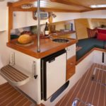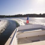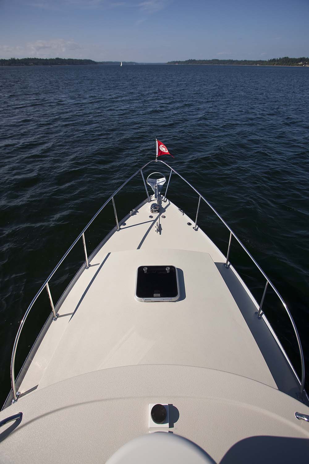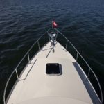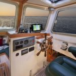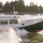 I remember heading north with my good friend George Gray (currently living with his wife on their sailboat and cruising the lovely waters of Mexico) to the Anacortes Trawler Fest show several years ago. It was a boisterous day with brisk winds of 25-30 knots coming out of the Southwest. With the fetch of Puget Sound and the short steep chop that can develop in those waters, it was a good test of what the Storm Petrel could do. With the following seas and our trying to maintain a pace of 16 plus knots of speed, the Storm Petrel would bound over the top of the crest of one wave and then pitch downward into the trough between the seas burying her bow into the wave just ahead of us till we could see water squirting up thru the anchor roller forward. Without slowing or slewing around in any way, she would then climb at the same speed up the face of the next wave reaching the top before pitching down again into the trough of the next. After about 30 minutes of this exhilarating ride, I remarked to George something about my amazement of such a remarkable ride to which he replied that he was impressed also. We chatted for a few more minutes about her amazing performance and no sooner had the words come out of my mouth, “we should turn around and try her head into the wind”, when I started turning the wheel. We did a good 15 minutes in reverse direction straight into the eye of the wind and those cresting waves with essentially the same results. The boat didn’t slow down and certainly didn’t broach or slew at the bottom of the troughs even when burying her nose deeply into the waves. Really, all in all, she showed remarkable capability for those seas, an incredibly pleasant boat to run on a day when I would normally wish I was home reading a good book by a warm fire. This combination of fine bow lines and entry with her broad and flat exit of run of the hull was literally the perfect example of what one would wish for in this type of boat.