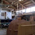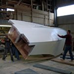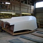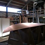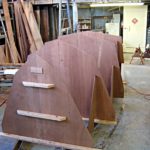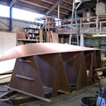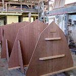 The Scout 20 was built over the stretch of a long year and was launched early fall of 2009 for John and Helen Carlson of Washington State. John had brought in the well thought out design to us from his own hand and we converted his basic hull shape to the Stitch and Glue boat building method. Once we agreed upon a price, we started in immediately by cutting out the bulkheads and other structural members and set them up on a simple building mold in the shop. A couple of days later, the plywood was scarfed for the hull panels and we had the bulkheads skinned over and were starting the cold molded layers (1/4, 6mm) on the bottom of the boat.