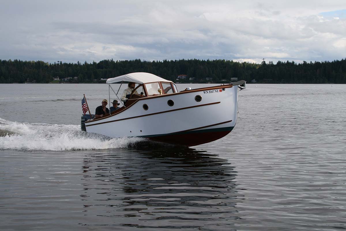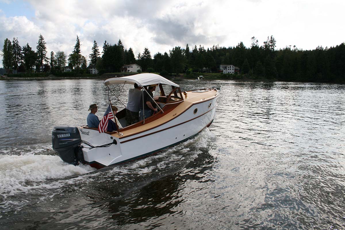 With Johns permission, we are working on the full homebuilder plans for her. I hope that you will enjoy the pictures of her under construction and cruising in the Sound and think that you will agree with me that this little boat has a real presence on the water. — Sam Devlin