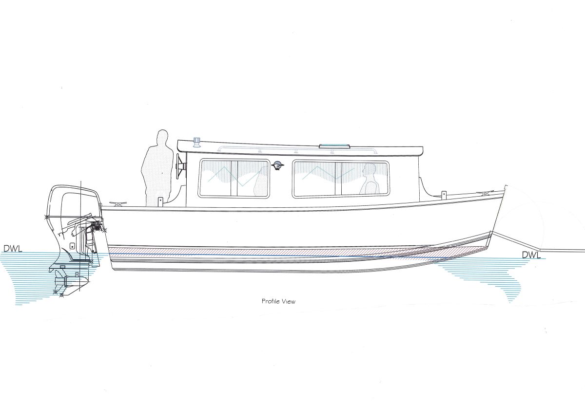 Recently Sam offered study plans for the Honker H.B. 20 – a houseboat placed into an extended and widened Honker, The study plans sales response was amazing. Could we go one better? Introducing the Mud Dauber 22 H.B. based on the Mud Dauber 23 design. The parallel sides of the hull allow more of a houseboat feel plus the beach landing gear in the bow offers shore access for extended beach cruising with all the luxuries of a tiny home on the water. She adds a foot and a half in length compared to the Honker and enables having a full time queen-size berth.