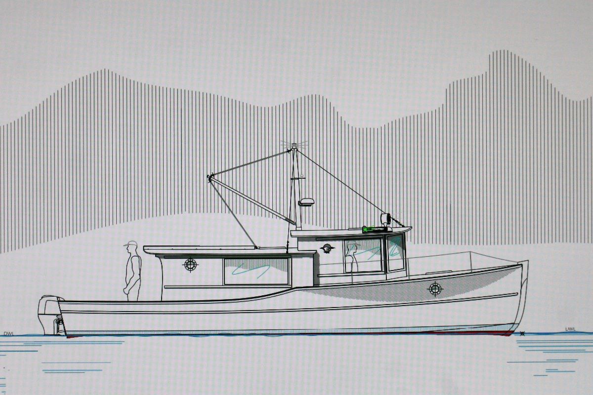 Like the MugWump 22, this new design from Sam is a perfect boat for the Great Loop voyage of a lifetime or for any and all of Europe’s canals. With a beam of 8 feet 5 inches and a length of 33 feet she fits on a tandem trailer that can be pulled by a pick-up truck with her 7,100 lbs. of displacement. When her highthrust outboard of 60-115 HP is tilted up she draws a mere 1 foot 2 inches. Great for shallow waters. An enclosed head is aft along with a lounge to port followed by a dinette to starboard and a galley just behind the pilot and copilot seats and 2 berths forward.