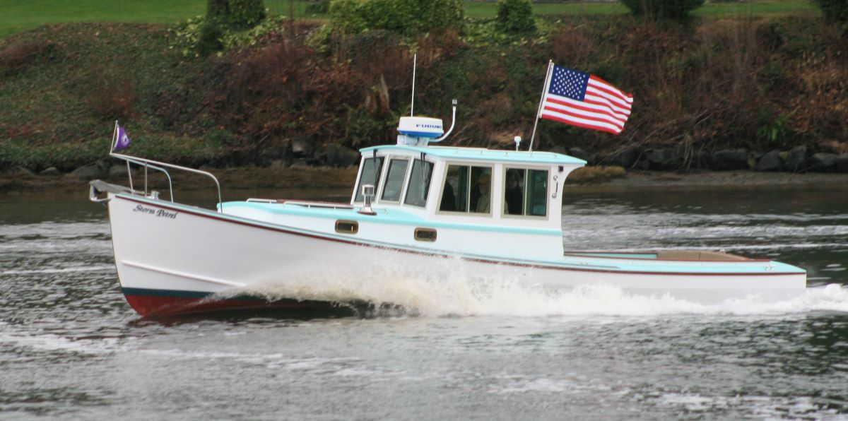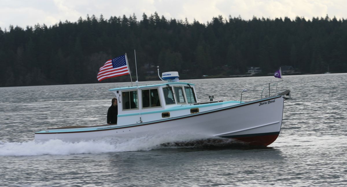 Storm Petrel was inspired by a customer who admired an Alvin Beal 26 foot lobster boat from the 1950s as rebuilt and reconfigured by Doug Hylan back in 2002. Sam knew the boat well and we currently have that very boat here in Olympia. The customer wanted a longer version with more of an interior including an enclosed steering station, a small head compartment and compact galley and a wood stove plus a v-berth. And of course it needed to be a stich and glue build. Sam designed the Storm Petrel for Cyndie who had been brought up in the boating world of Seattle. Today Cyndie’s son carries on a family tradition as the owner of Storm Petrel.
