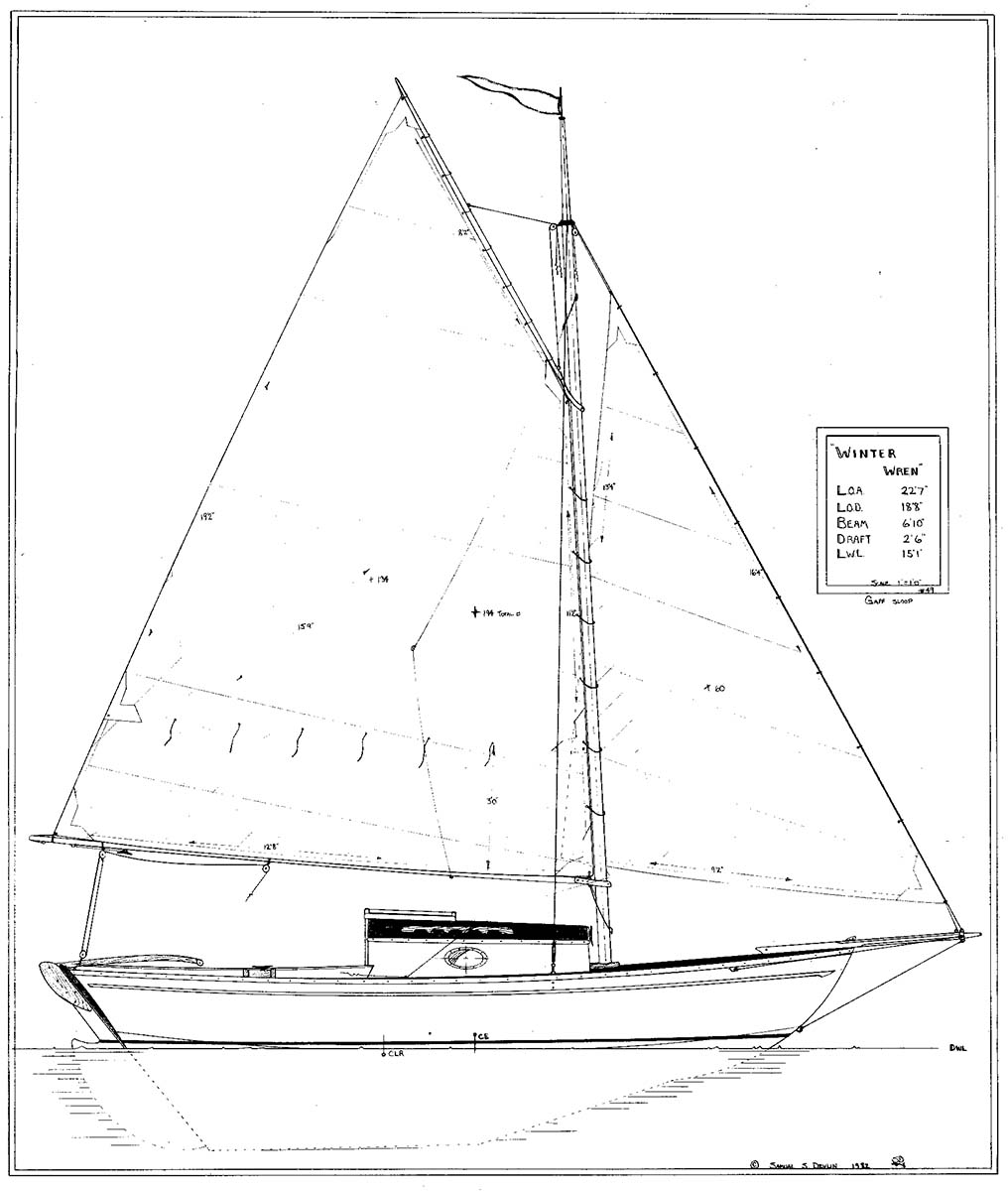The Winter Wren carries her 195 sq. ft. gaff rig gracefully and has proven herself the equal of boats in her size range. She sails through 90 degree tacks to windward, and off the wind, the gaff rig provides unexcelled performance. The helm is well-balanced and invites the sailor to enjoy a variety of wind and sea conditions.