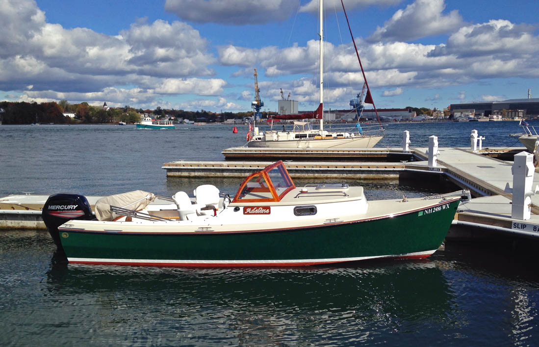 Hi, folks. ‘Adeline’ is a Pelicano 20, a custom designed version of the Pelicano Bass Boat that Sam and crew built for Henry Clews and Nancy Chandler in Portsmouth, New Hampshire. I spoke to Henry a few days ago, and he graciously agreed to write up his experiences with Adeline. He did such an excellent job that I’ll just hand it over to Henry…