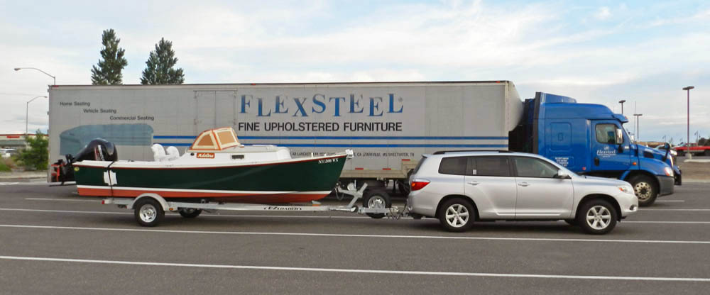 Just as I’d hoped, the boat was the perfect size for trailering behind a “normal” car. A single-axle trailer without brakes worked just fine. I’m guessing the whole package; boat, motor and trailer weigh a little less than 3000 pounds. In any case, she tows behind our 2008 Toyota Highlander very nicely. I know, I towed her over 3000 miles from Washington state back to our summer home in Portsmouth, New Hampshire – most of the way at 70 mph. (I saved the $3500 shipping cost by doing this.)