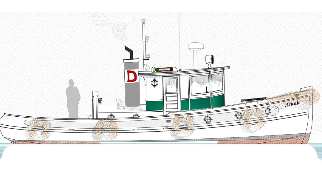 Tugboats have been a long standing theme in my life and I started my tug-affliction at an early age. When I was in kindergarten at the age of 5, I won an art competition with a tugboat composition and even though the medium was smeary crayon, it showed some promise of tug-work in my design quiver even at that young phase of my life. During my college years, I worked on several different tugs in Alaska, saving my money and helping to grubstake me thru school at the University of Oregon. The very first tug that I worked on was named the ‘Amak’ and a fine example of the type she was, home ported in Ketchikan, Alaska and as I recall, built in the late 1890s. She was wood, of course, nicely detailed (though she was a working tug), had a Cat diesel engine and after just a few days on board, I was hooked. The ‘Amak’ was to change my life. I read issue #1 of WoodenBoat magazine onboard her and made up my mind that boats, indeed wooden boats, were to be my life choice of hobby, avocation, passion, and career.