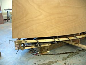 Hull-is-lifted-up-6-inches-above-bulkheads-and-sheer-clamp-laminated-up-in-position by Lee Sandifur | Apr 18, 2019
