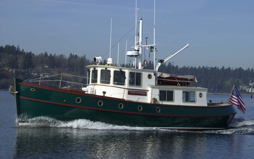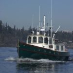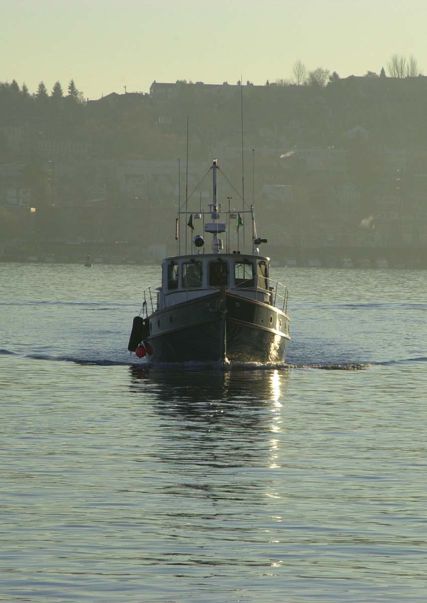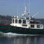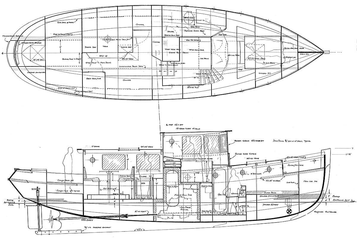 The Sockeye 42 is a full displacement type boat with an almost workboat type appearance, enough room inside to be comfortable with two couples and with modest enough draft to allow it to cruise in almost any waters you might encounter on the West or the East Coasts. The profile is straight West Coast Tug type yacht with a heavy portion of fishboat thrown in. With twin masts in a Ketch configuration, this boat would allow a variety of deck boats to be handled on and off the deck. I have shown her with dry stack exhaust and would recommend a 145 HP John Deere marine engine. This baby weighs in at 1,500 lbs. and runs at a top speed of 2,400 rpm. She is big, heavy, slow turning and would be a good match for this type of hull. The hull itself is of the fantail configuration and would be very seakindly in the full displacement range of performance. Top speed would be 9 knots and cruising speed would be 8 knots at about 3-4 gallons of fuel per hour. The engine is below the pilothouse sole and is sound insulated to result in an interior that is quiet and warm.