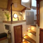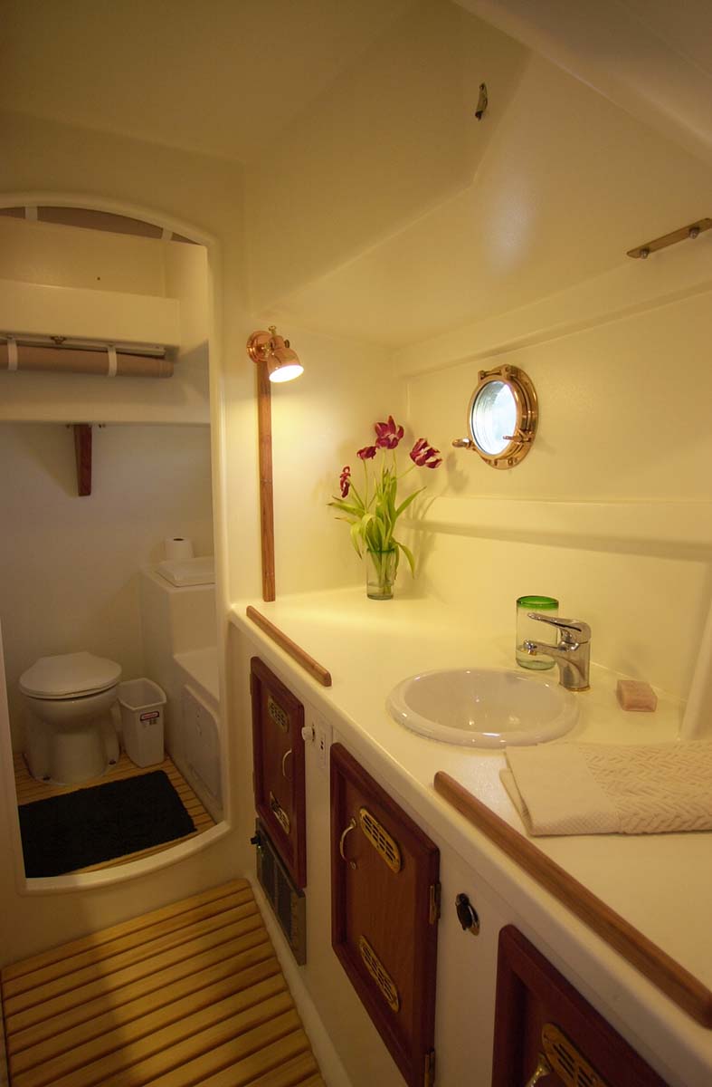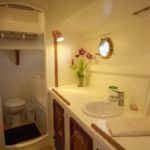 Going below into the fo’c’sle, the head is to port with the shower compartment being accessed below the seating part of the settee in the pilothouse. Again there is more room at the water closet than in most boats that you might be used to and there should be plenty of room for the crew to be comfortable and private. The double berth is forward to the port side and has a vanity opposite for the fair skinned crew to put their faces on in the morning.