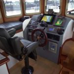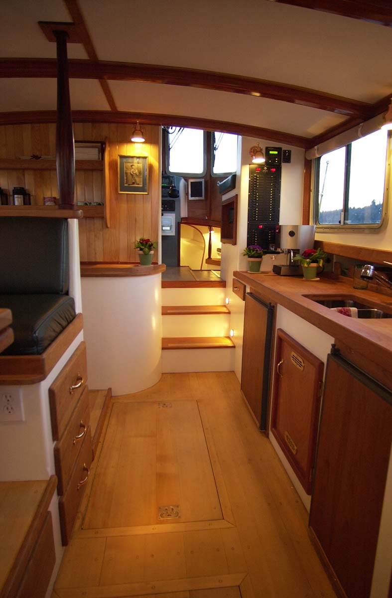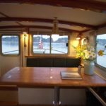 Going up the steps into the pilothouse the helm is on the centerline with an L-shaped settee to port and chart table to starboard. The helm seat should be a swiveling helm seat of fit and construction of the type to allow long watches to be done comfortably.