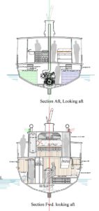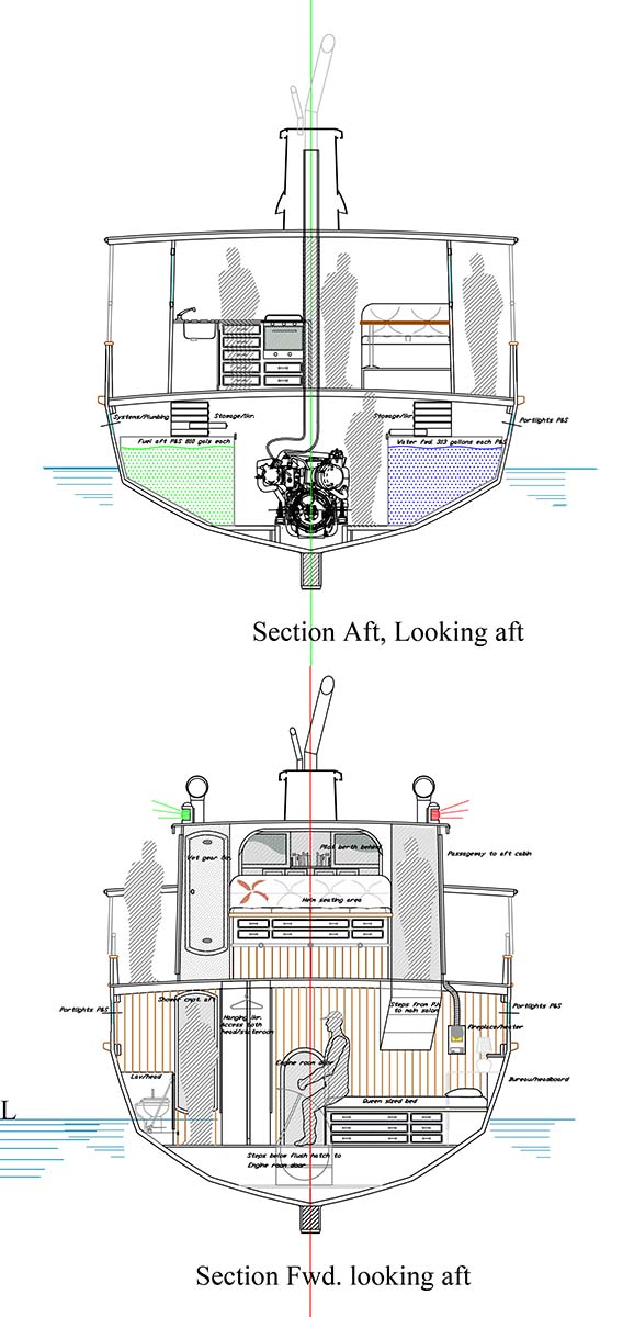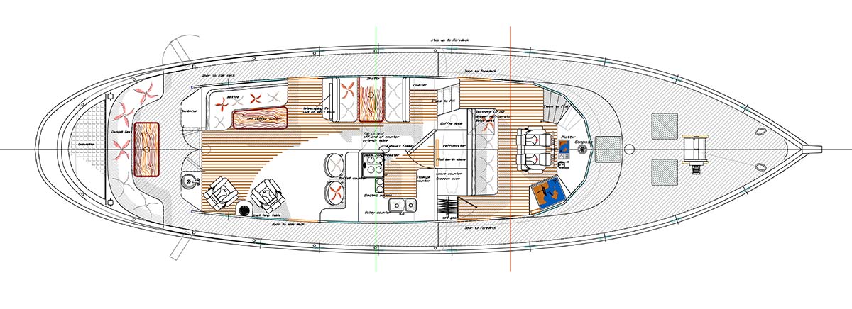Think of the pack of friends that could be invited to come along for the day — lots of tending lines to do and the Skipper needs to focus on keeping the boat in the channel. These drawings are pretty much self-explanatory and worth a walk thru the boat from stem to stern. A hull laminate of fully 2.25 inches of sandwiched marine plywood with a layer of Kevlar cloth embedded between each layer, this puppy will stop any bullet shot at it or blunt off any deadhead she encounters. Range would be something north of 3,500 nautical miles and the comfort level would be very high.