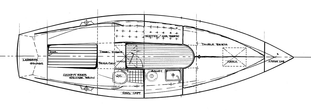 A diesel engine was planned for in the design and a 3/4 length full keel allows shoal draft capability with the easy balanced helm of a fully separate rudder system. This Keel/ rudder combination allows a very sensitive helm that tracks extremely well and has a bit more efficiency than a normal full keel/transom hung rudder arrangement. And with the transom hung rudder a very strong rudder connection is possible and servicing and maintenance is easy and quick. A large cockpit was planned to accommodate up to four adults for sailing with comfort, and single winches for headsails are right at hand and convenient to use.