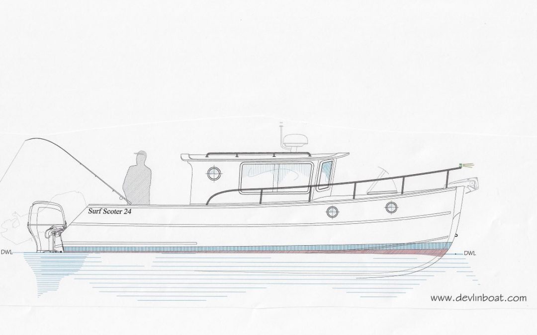 Just a few years back Sam designed and built two Surf Scoter 23s. What was new over the Surf Scoter 22 Cruiser? – More Cockpit space, a larger forward berth area, and forward slanted windows in the pilothouse. The berth area became much more open to the pilothouse area. Many viewed the Surf Scoter 23 at the recent Port Townsend Wooden Boat Show. Always listening to customers, Sam has responded to requests for the same boat with a bit more galley and an enclosed head. We now offer the new design as a downloadable study plan – The Surf Scoter 24.